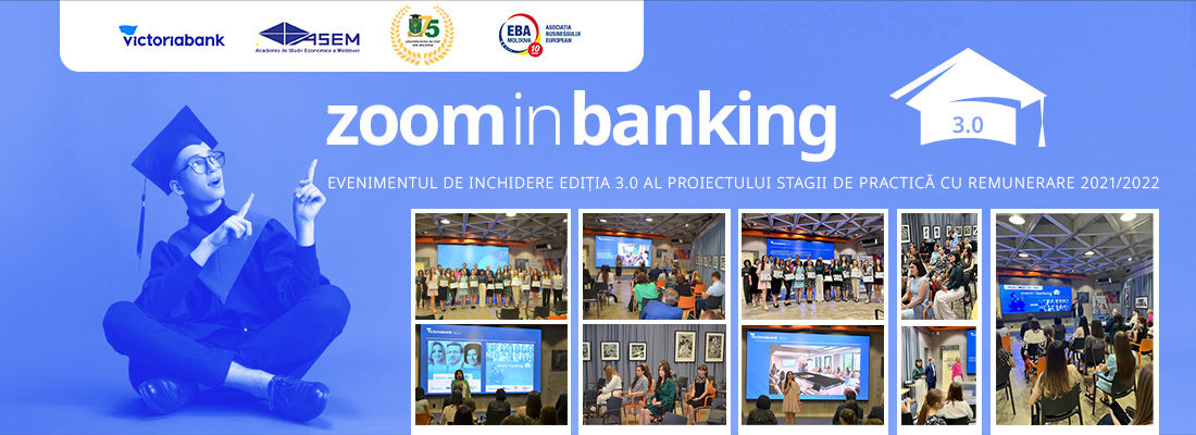 Zeci de studenți au gustat din bucătăria financiar-bancară a celei de-a treia ediții a proiectului educațional „Zoom in Banking | Stagii de practică cu remunerare” 3.0. Cei mai activi dintre ei care au finalizat programul cu succes au fost premiați în cadrul unui eveniment de încheiere. Proiectul a fost inițiat în anul 2020 de către Victoriabank, Asociația Businessului European (EBA) și Academia de Studii Economice din Moldova, cu scopul de a îmbunătăți cunoștințele și abilitățile practice ale studenților, prin implicarea celor mai buni specialiști în banking.