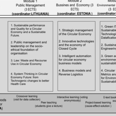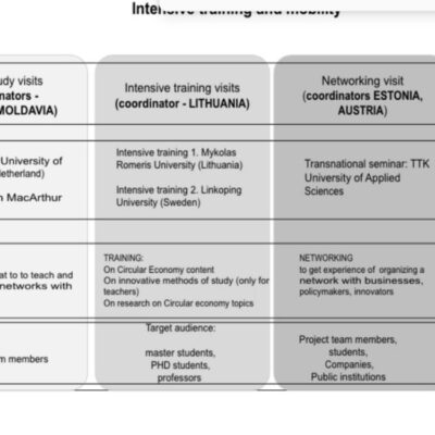 - WP2: Dezvoltarea modulelor educaționale pentru economia circulară – un element cheie al proiectului, coordonat de Assoc. prof. dr. Aušra Šukvietienė, care va integra noțiuni precum gândirea ecologică, management sustenabil și schimbările climatice în programele universitare.