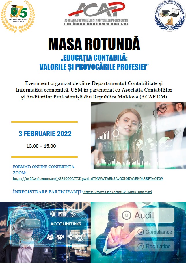 Departamentul Contabilitate și Informatică economică din cadrul Facultății de Științe Economice la 3 februarie 2022 cu începere de la ora 13.00 organizează masa rotundă cu genericul „Educația contabilă: valorile și provocările profesiei”. Este un eveniment organizat către Departamentul Contabilitate și Informatică economică în parteneriat cu Asociația Contabililor și Auditorilor Profesioniști din Republica Moldova (ACAP RM).