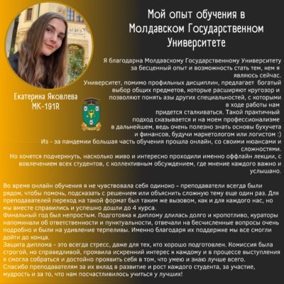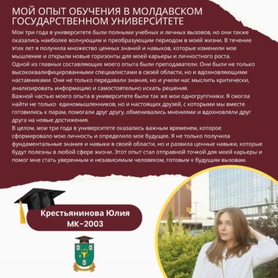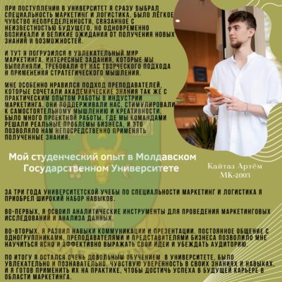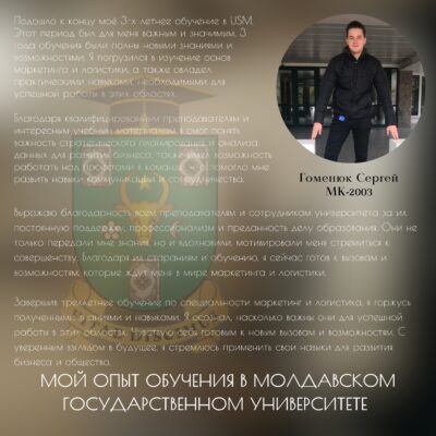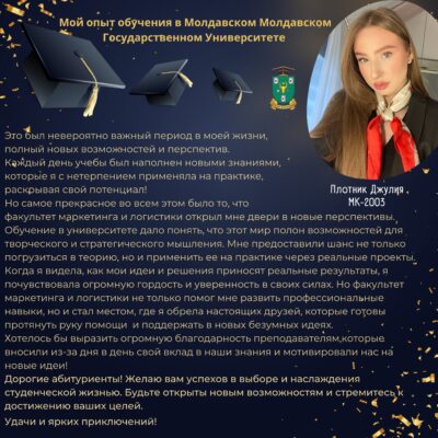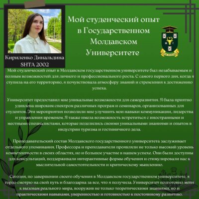 Выпускники наших программ высоко оценивают качество учебных программ, преподавателей и ресурсов, предоставляемых Молдавским государственным университетом, для приобретения крепких знаний и актуальных навыков в области маркетинга и туризма. Возможности развития карьеры через программы стажировок в ведущих компаниях отрасли значительно способствуют облегчению доступа выпускников к рынку труда и развитию их карьер в отрасли. Студентам предоставляется множество возможностей применить полученные знания на практике, включая исследовательские проекты, стажировки и сотрудничество с деловым сообществом, и по достижении статуса выпускника, они участвуют в роли наставников для других студентов, обучающихся в настоящее время. Программы магистратуры акцентируют внимание на развитии меж профессиональных навыков, таких как коммуникация, решение проблем, создание собственных проектов и стратегическое мышление, готовя выпускников к вызовам в области маркетинга и туризма.