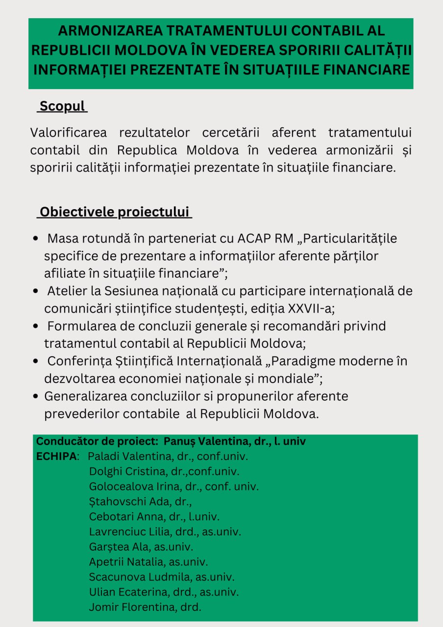 ARMONIZAREA TRATAMENTULUI CONTABIL AL REPUBLICII MOLDOVA ÎN VEDEREA SPORIRII CALITĂȚII INFORMAȚIEI PREZENTATE ÎN SITUAȚIILE FINANCIARE Thursday, 4 April 2024Friday, 5 April 2024 RAPORT ȘTIINȚIFIC ANUAL 2023: Armonizarea tratamentului contabil al Republicii Moldova în vederea sporirii calității informației prezentate în situațiile financiare